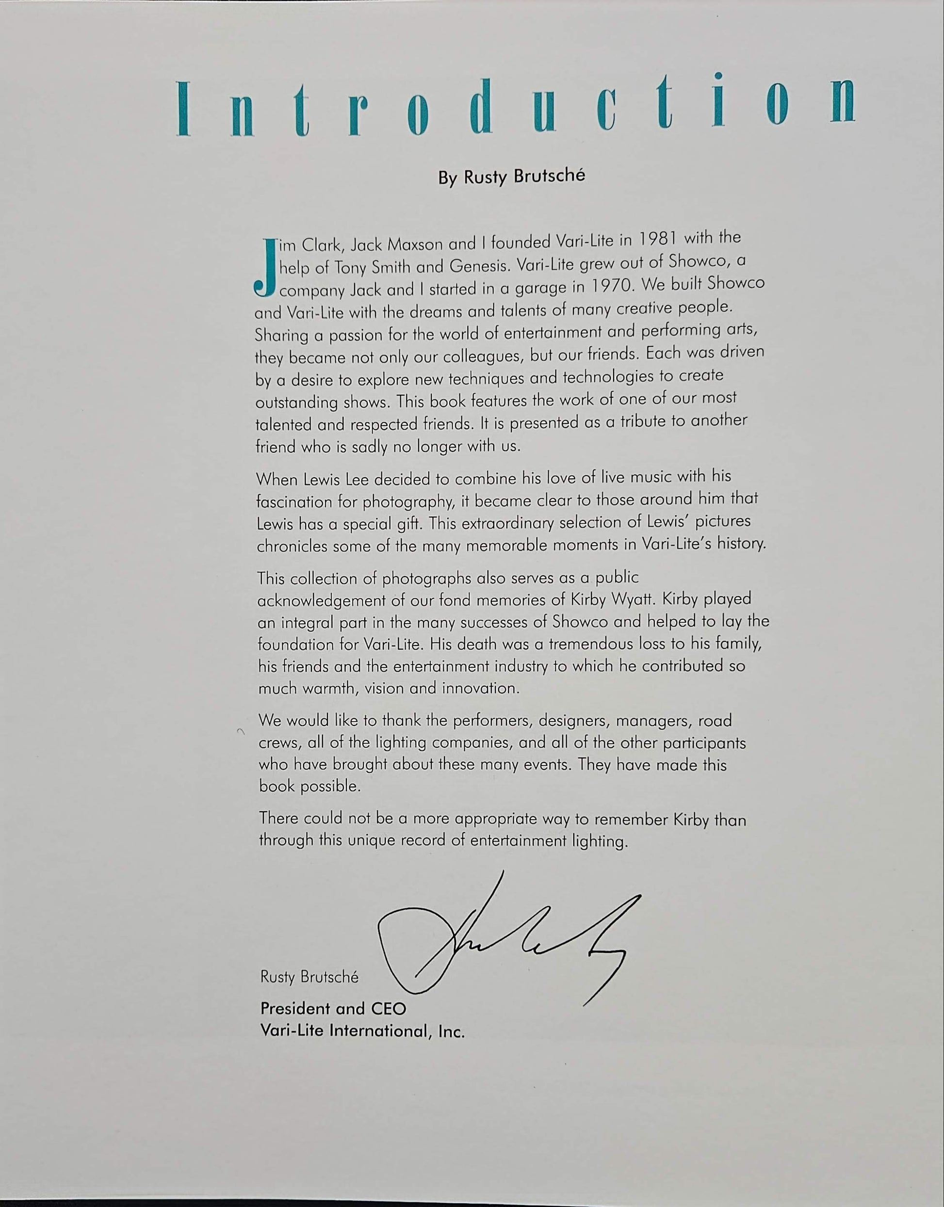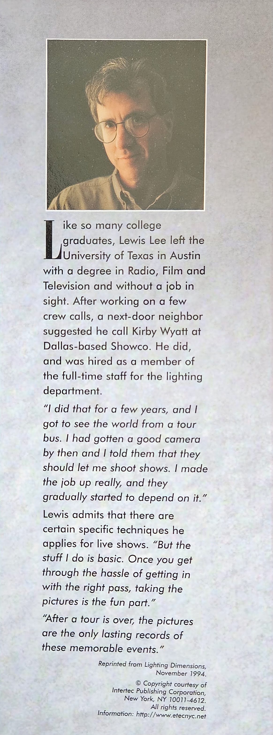 - Photography: All images by Lewis Lee, longtime Showco and Vari-Lite crew member and photographer