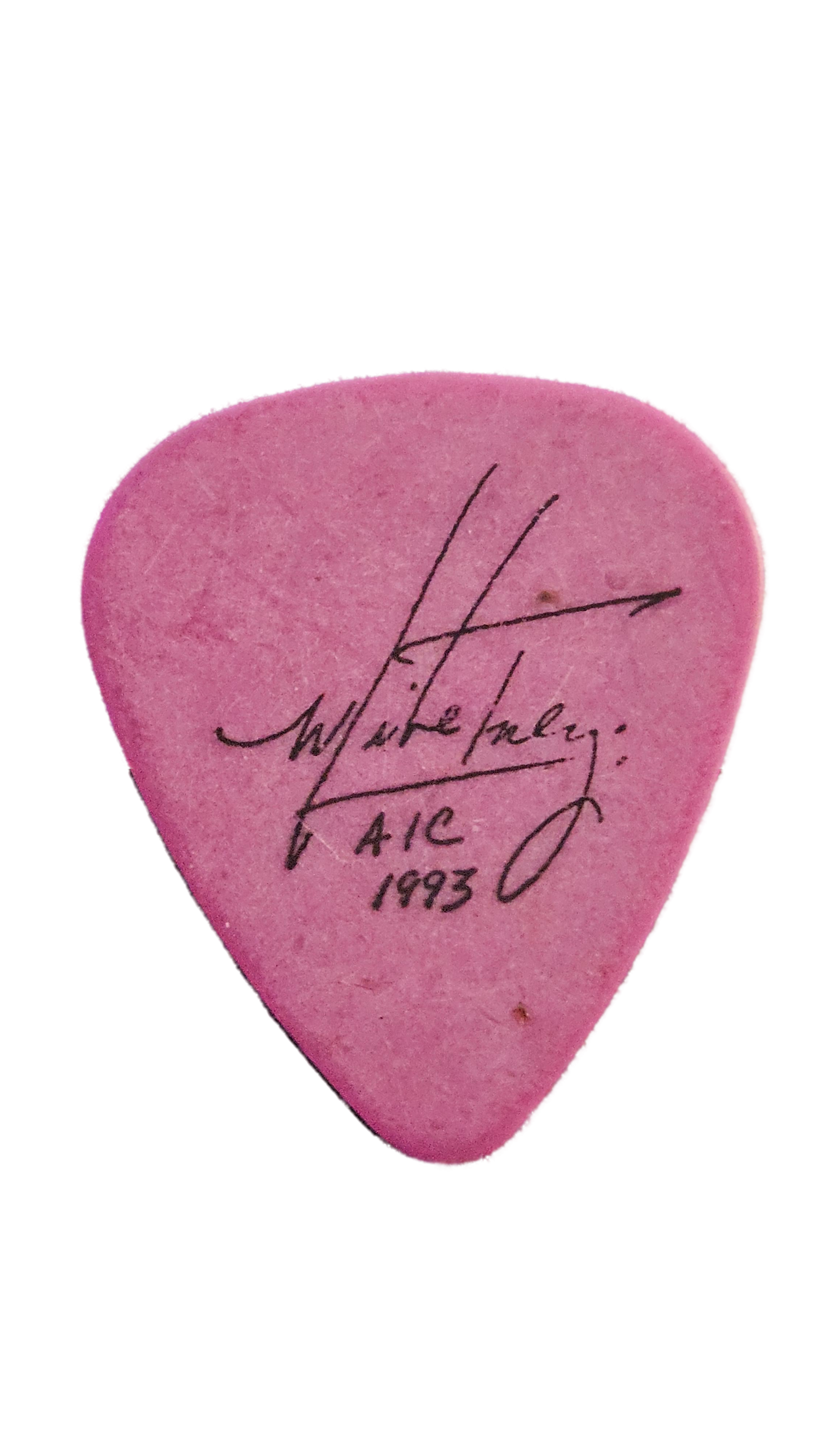 Authentic Alice in Chains guitar pick in purple. Sourced from Showco alum Johnny “JW” Roberts via Showco Archives.