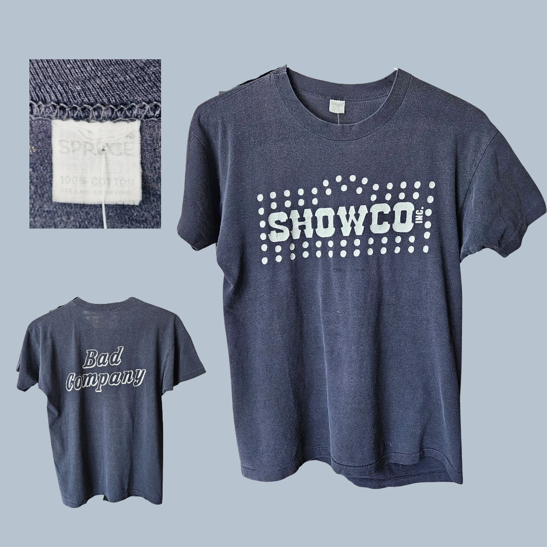 From the personal collection of Showco alum Lewis Lee, this Showco Bad Company tour shirt is navy with white printing. Worn, classic vintage rock.