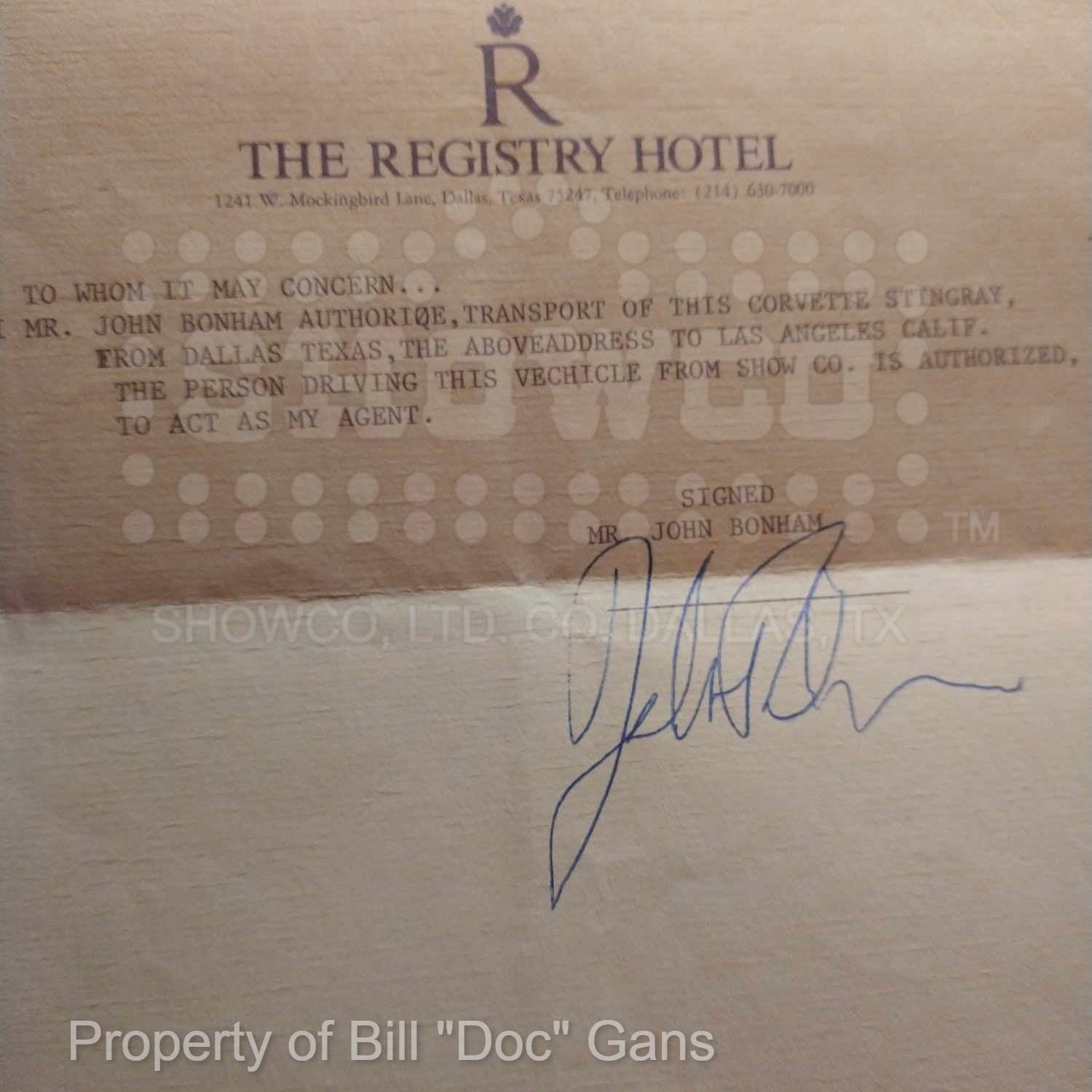 Story: Bonham asked Doc Gans and Lacy Weathers to transport a Corvette to LA that Bonham bought from a Dallas hotel owner. A funny story accompanies about the delivery to Bonham and Keith Moon at the Hyatt House.