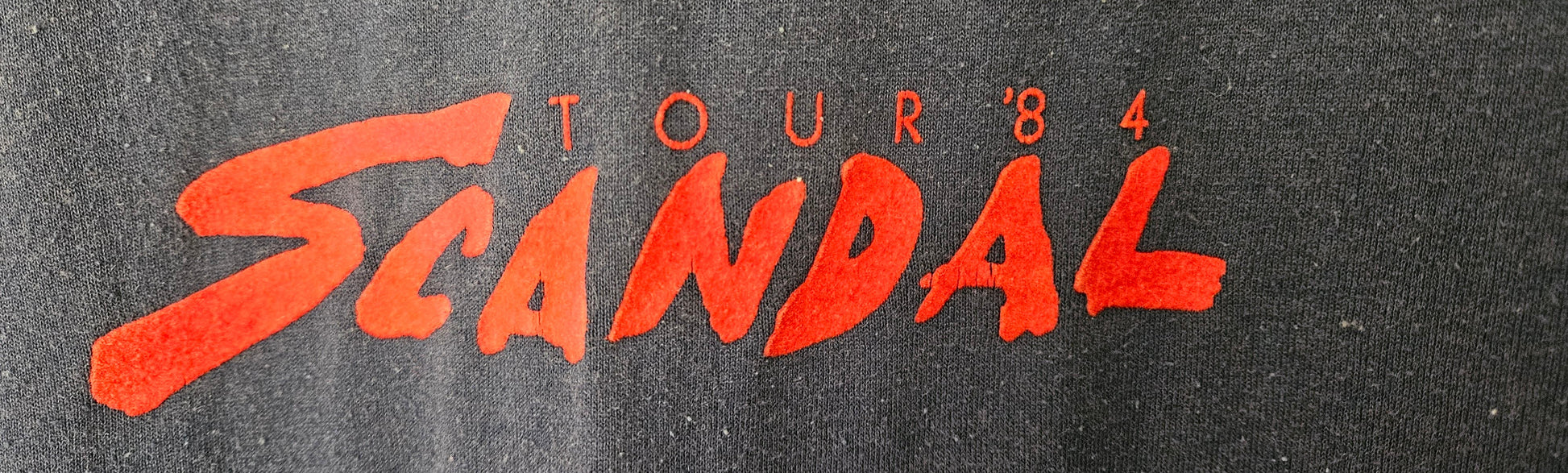 Showco - Vari-Lite 1984 Scandal Crew Shirt This striking blue crew shirt features red velvet flocking, capturing the essence of vintage 80s style! A true piece of history from Bruce's collection, who served as FOH for Scandal and Patty Smyth. Size L: 19" W X 26" L. Don't miss the chance to own this unique collectible!