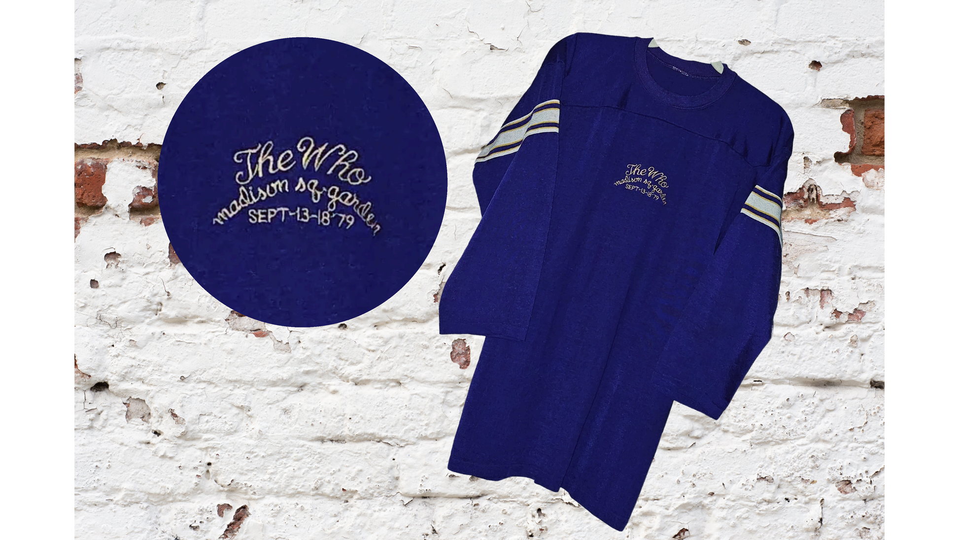 Capture a piece of music history with this rare vintage jersey shirt celebrating The Who's unforgettable 1979 Madison Square Garden performance. This exclusive item commemorates The Who's first tour following the loss of drummer Keith Moon and marks their return to live performance. Made of soft purple fabric with exquisite gold embroidered lettering, this shirt is a must-have for any music memorabilia collector. This piece comes from Showco alum, Donnie Kretzschmar's Collection.